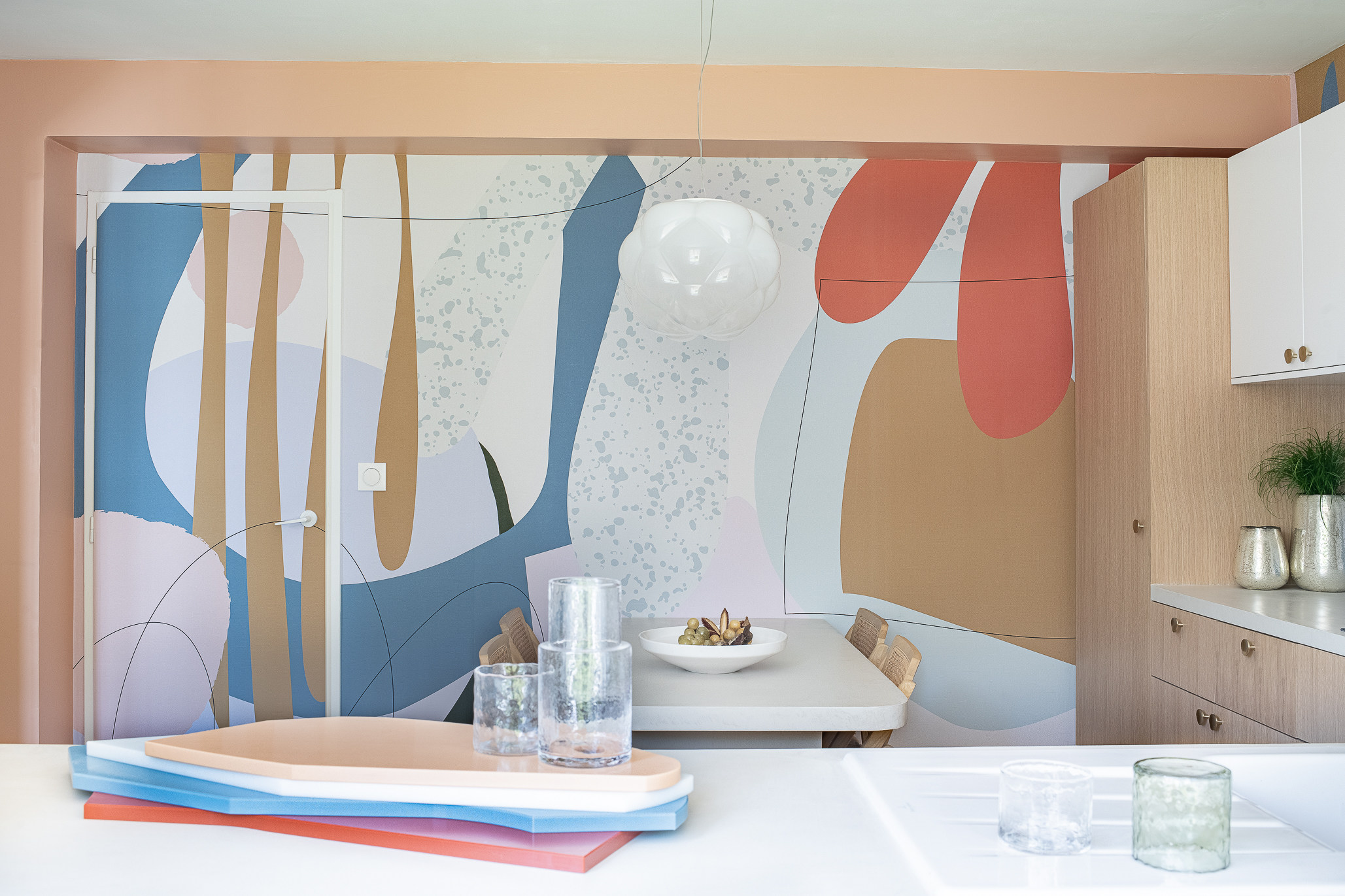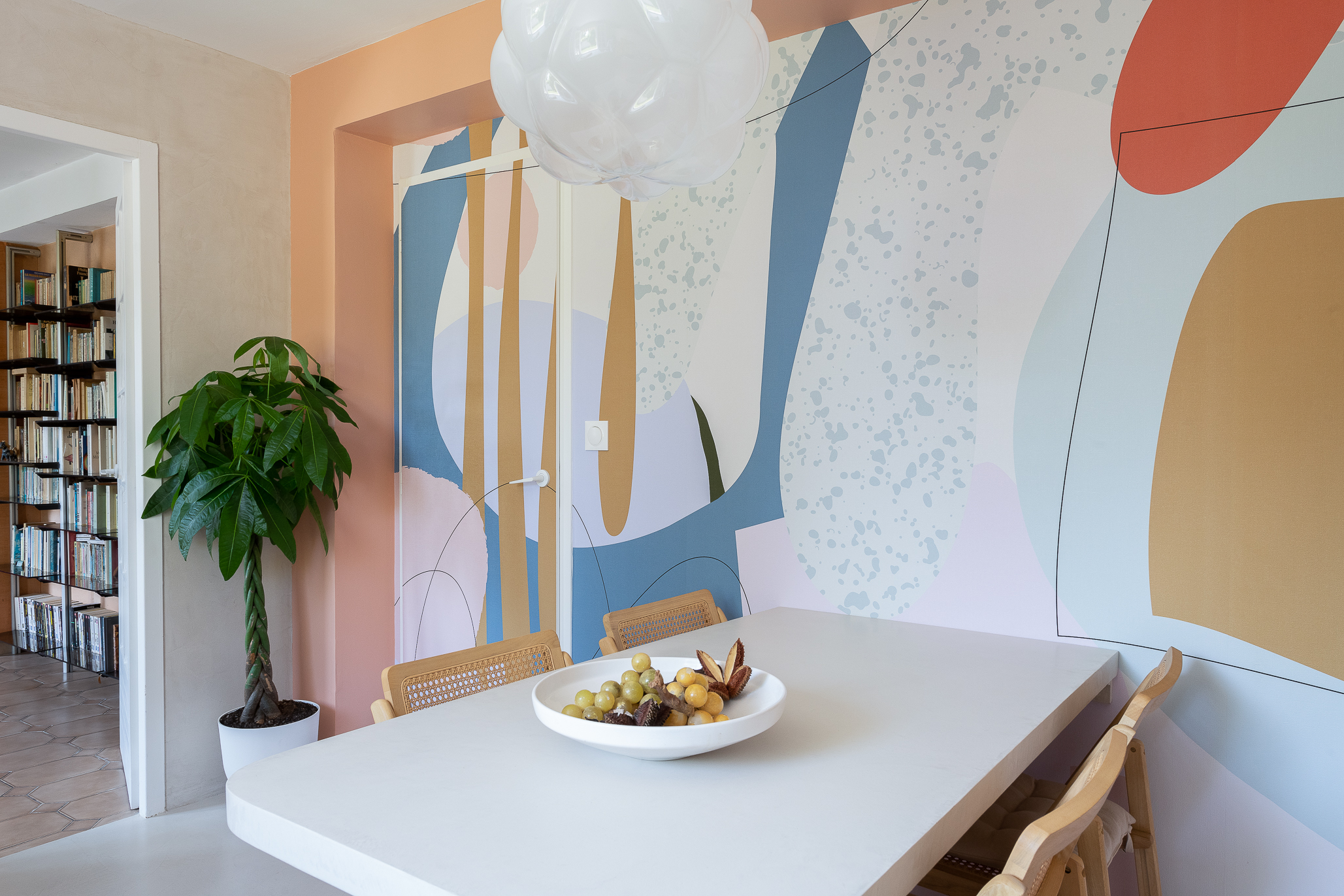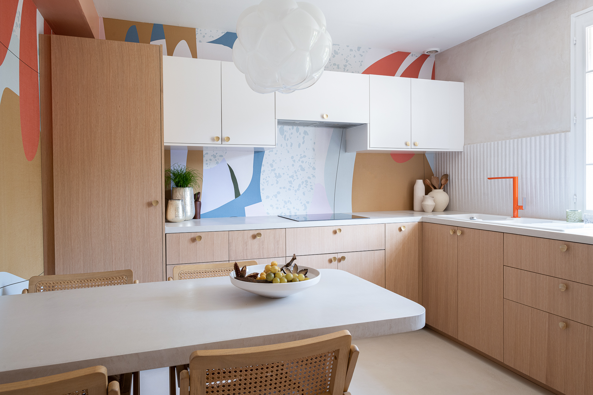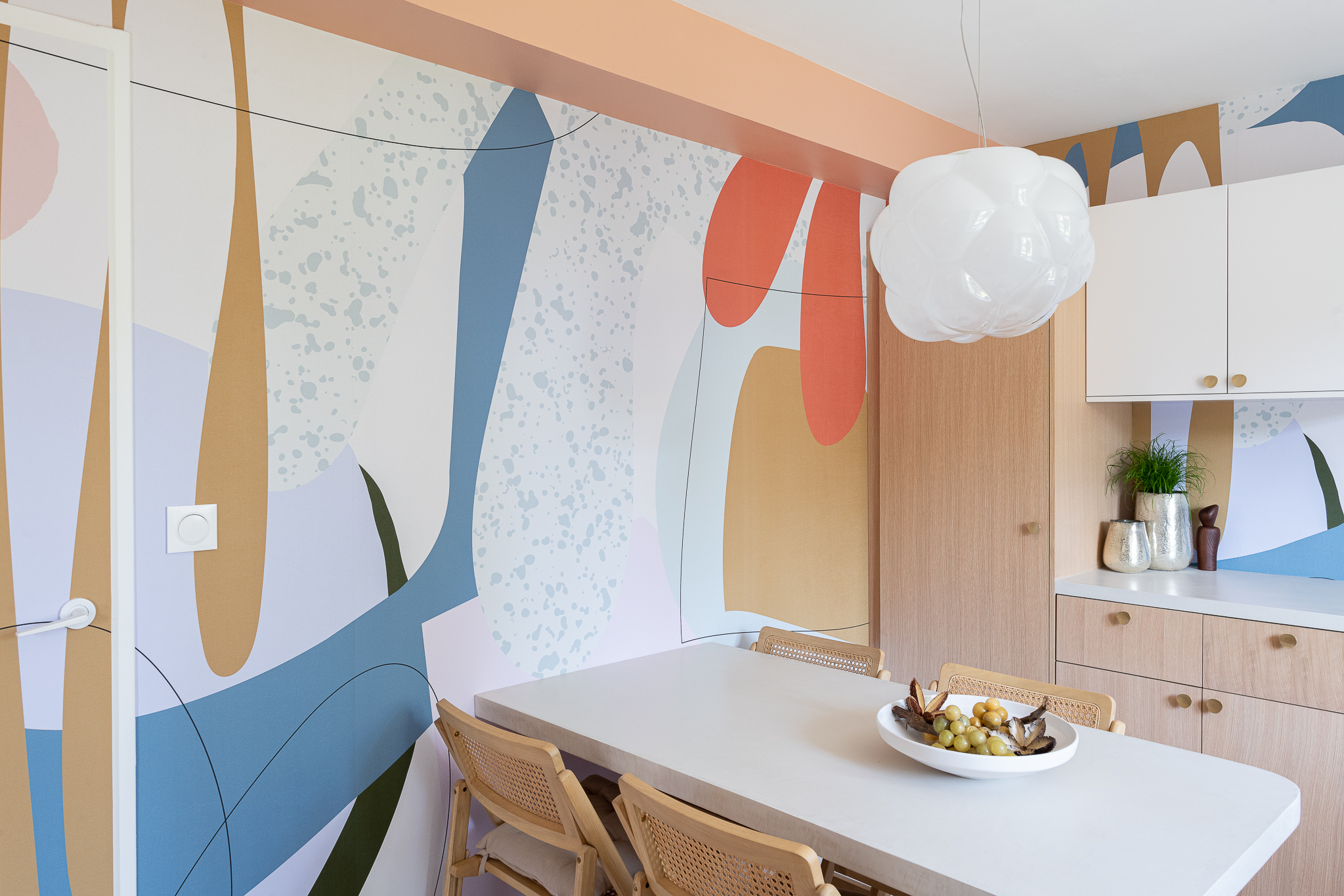 Ce projet d’architecture d’intérieur s’inscrit dans la rénovation complète d’une cuisine, pensée autour d’un concept coloré et joyeux, exprimant une véritable joie de vivre tout en conservant un équilibre subtil. Les choix de matériaux traduisent cette intention : un papier peint aux mouvements organiques et aux teintes vibrantes apporte une dimension expressive et vivante, tandis que le béton ciré, appliqué sur le plan de travail, le sol, les murs et la table, crée une continuité visuelle sans joints, générant une sensation d’harmonie, de plénitude et de calme. Les carreaux ont été sélectionnés pour leur géométrie affirmée, jouant un rôle de transition entre le caractère minéral du béton ciré et l’univers plus dynamique du projet, tout en introduisant un jeu de lumière et de rythme qui enrichit l’espace.