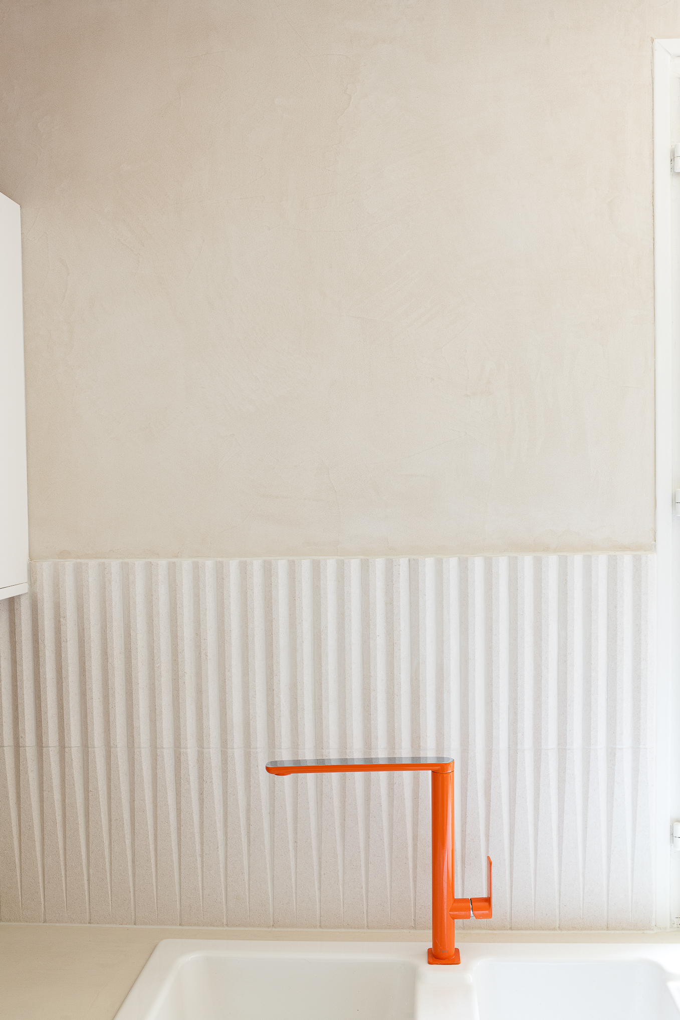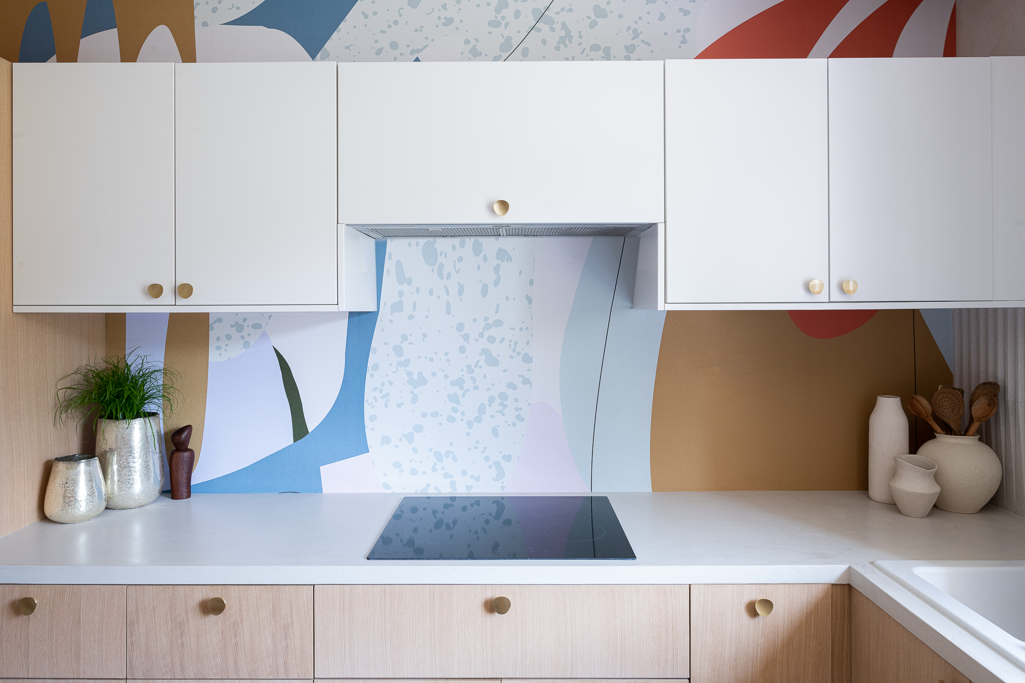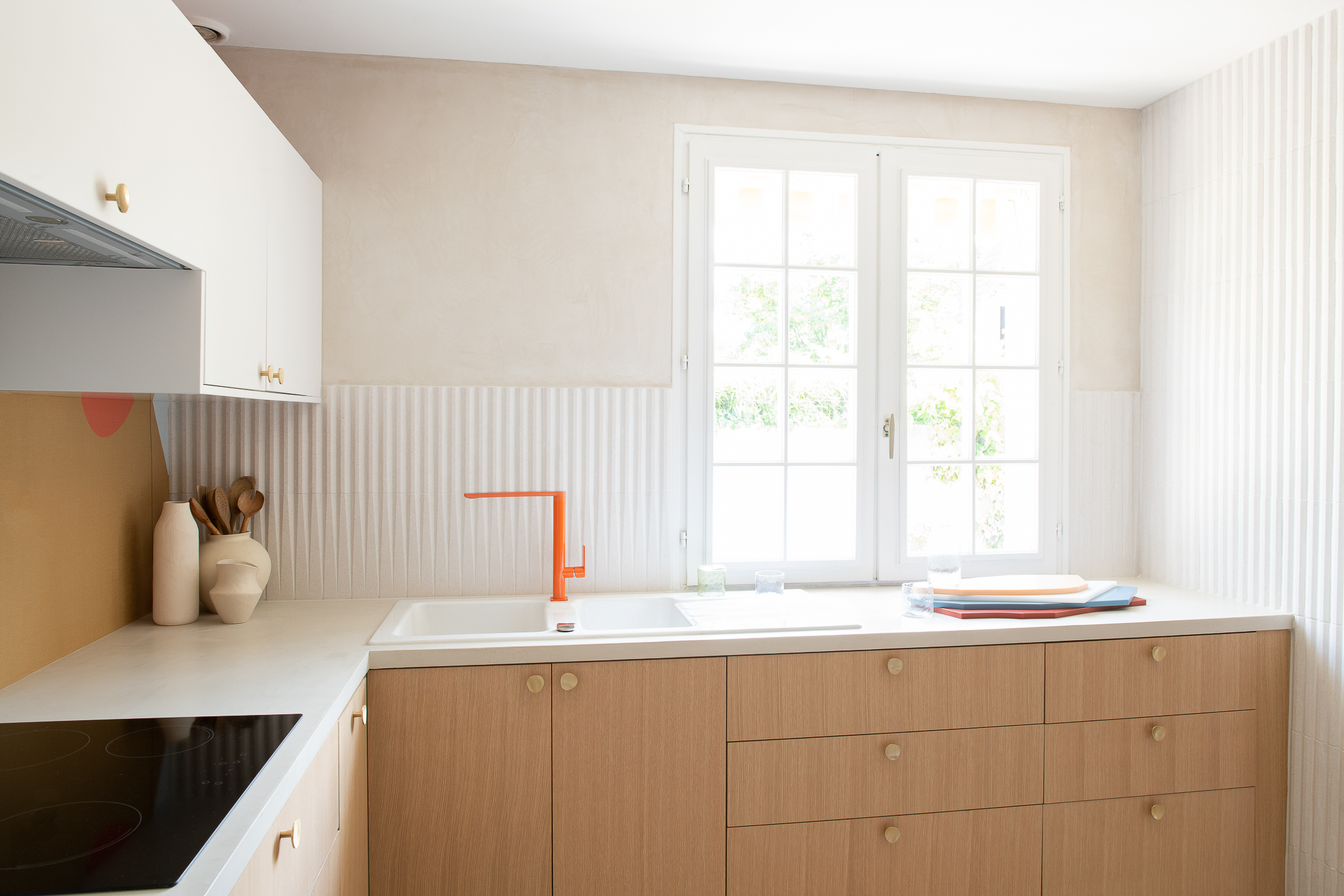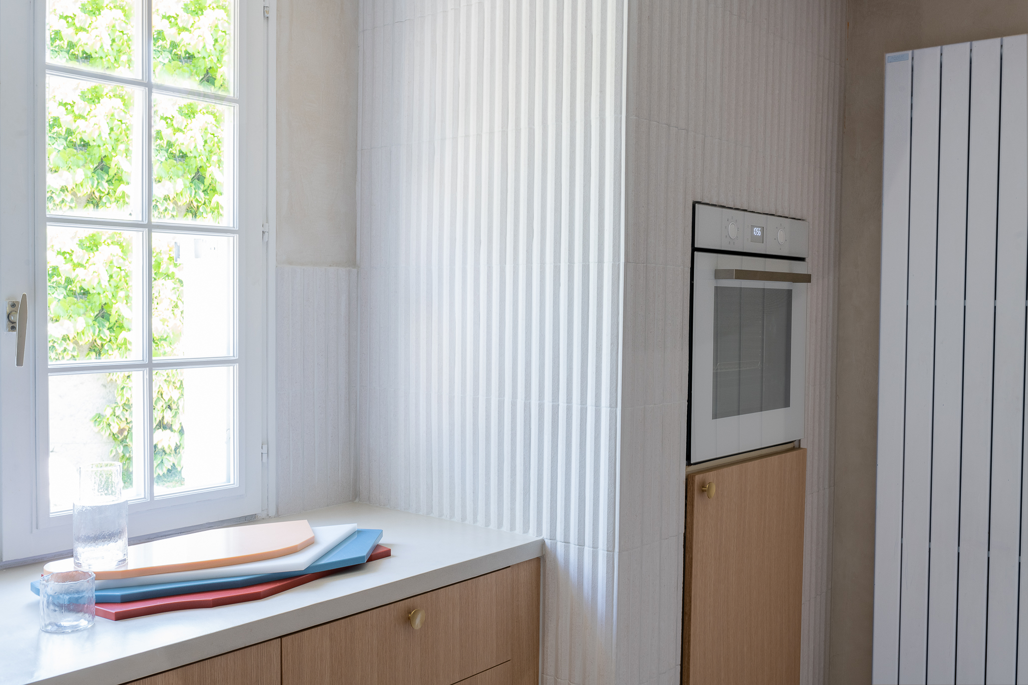 Ce projet d’architecture d’intérieur s’inscrit dans la rénovation complète d’une cuisine, pensée autour d’un concept coloré et joyeux, exprimant une véritable joie de vivre tout en conservant un équilibre subtil. Les choix de matériaux traduisent cette intention : un papier peint aux mouvements organiques et aux teintes vibrantes apporte une dimension expressive et vivante, tandis que le béton ciré, appliqué sur le plan de travail, le sol, les murs et la table, crée une continuité visuelle sans joints, générant une sensation d’harmonie, de plénitude et de calme. Les carreaux ont été sélectionnés pour leur géométrie affirmée, jouant un rôle de transition entre le caractère minéral du béton ciré et l’univers plus dynamique du projet, tout en introduisant un jeu de lumière et de rythme qui enrichit l’espace.