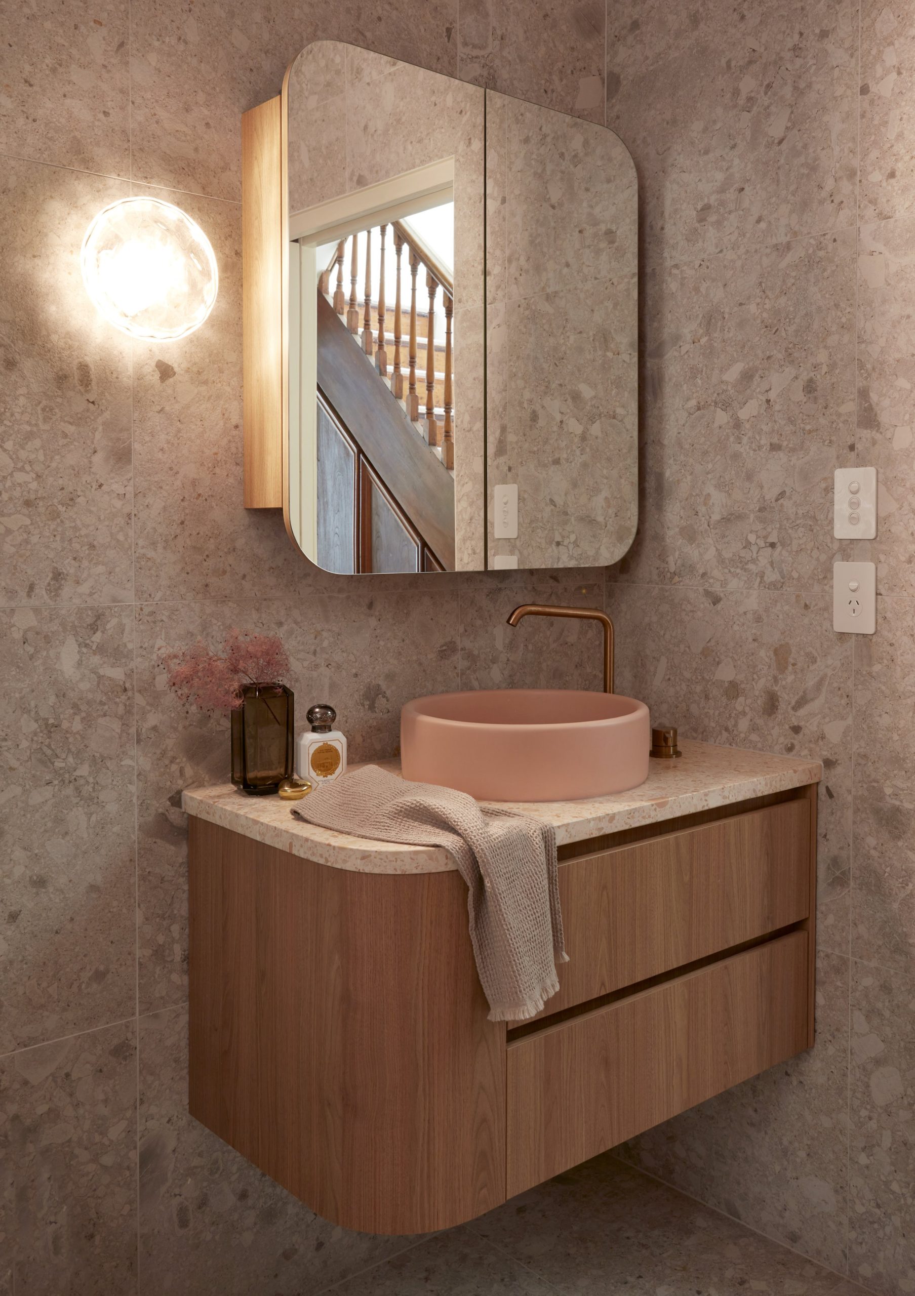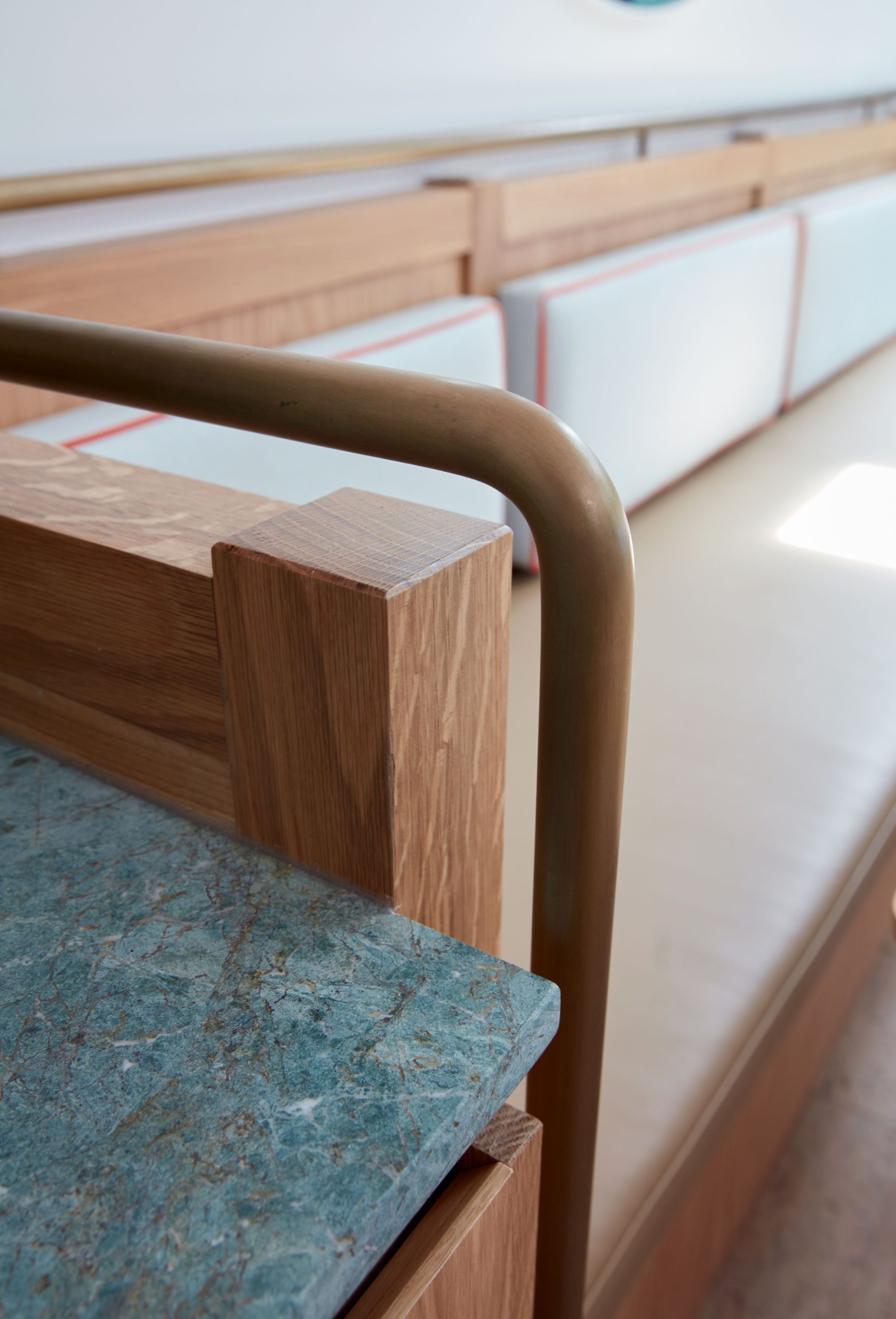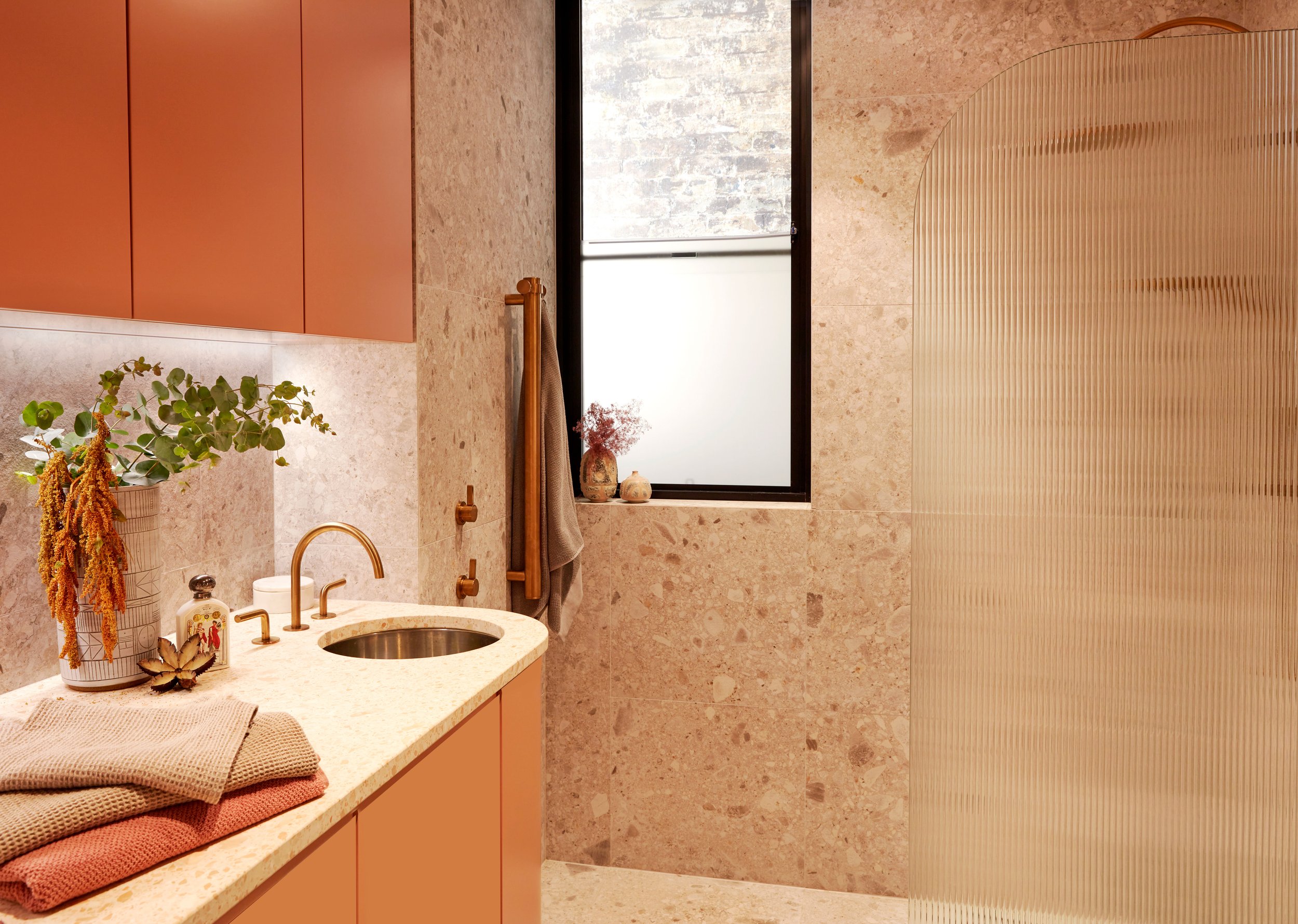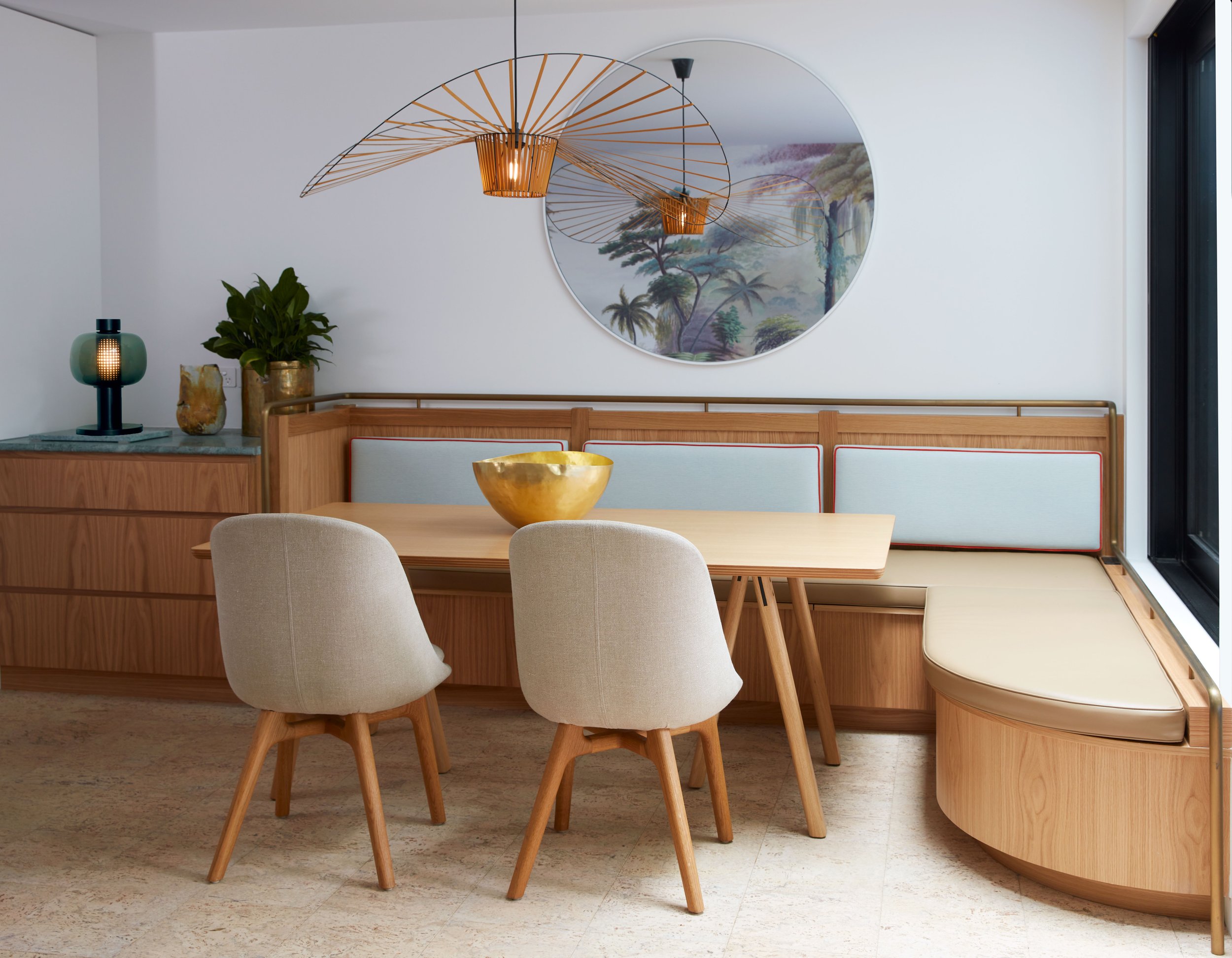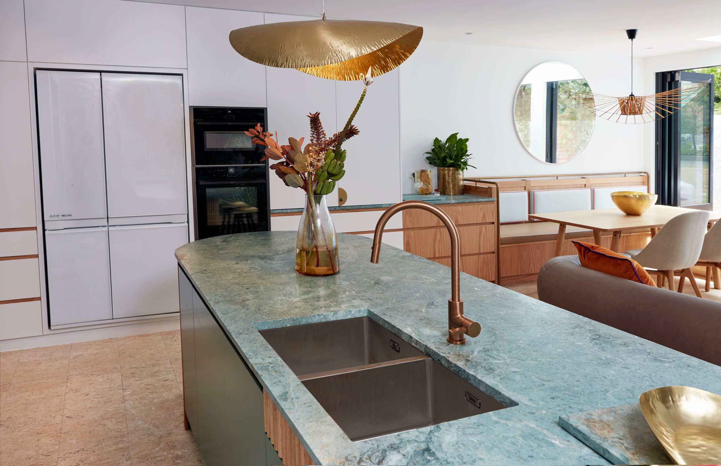 Ce projet s’articule autour de la rénovation complète d’une maison, accompagnée d’une extension du rez-de-chaussée et de l’étage supérieur, repensée dans une logique d’open plan. Les espaces de vie ont été conçus pour favoriser la fluidité, la convivialité et une connexion constante avec le jardin et la nature. La cuisine sur mesure ainsi que la banquette intégrée autour de la salle à manger ont été dessinées comme des éléments structurants, adaptés à un mode de vie familial dynamique. Le choix des matériaux reflète une approche consciente de l’environnement, conciliant durabilité, confort et besoin de calme face au quotidien d’enfants actifs. Les salles de bains ont été recréées selon les usages et attentes des clients : l’une, déclinée dans une nuance de bleu royal, offre une atmosphère enveloppante propice au repos et à la relaxation autour du bain ; la seconde propose une ambiance plus légère et fonctionnelle, intégrant la buanderie dans des tons rosés doux et lumineux.