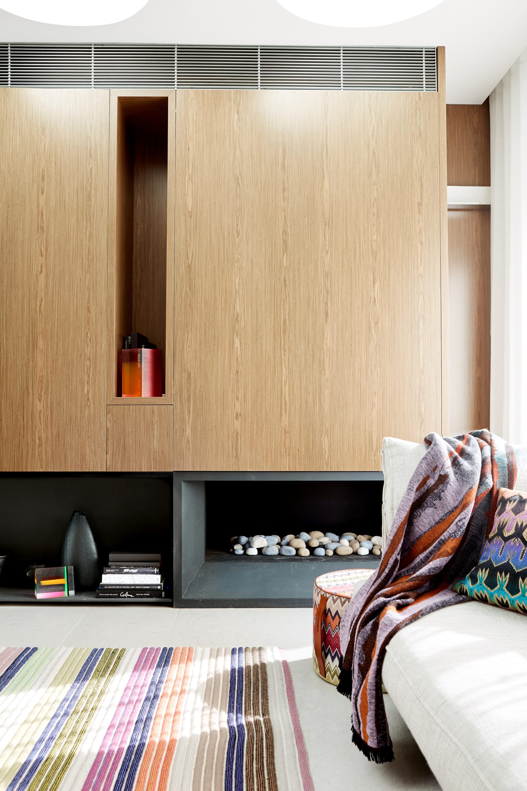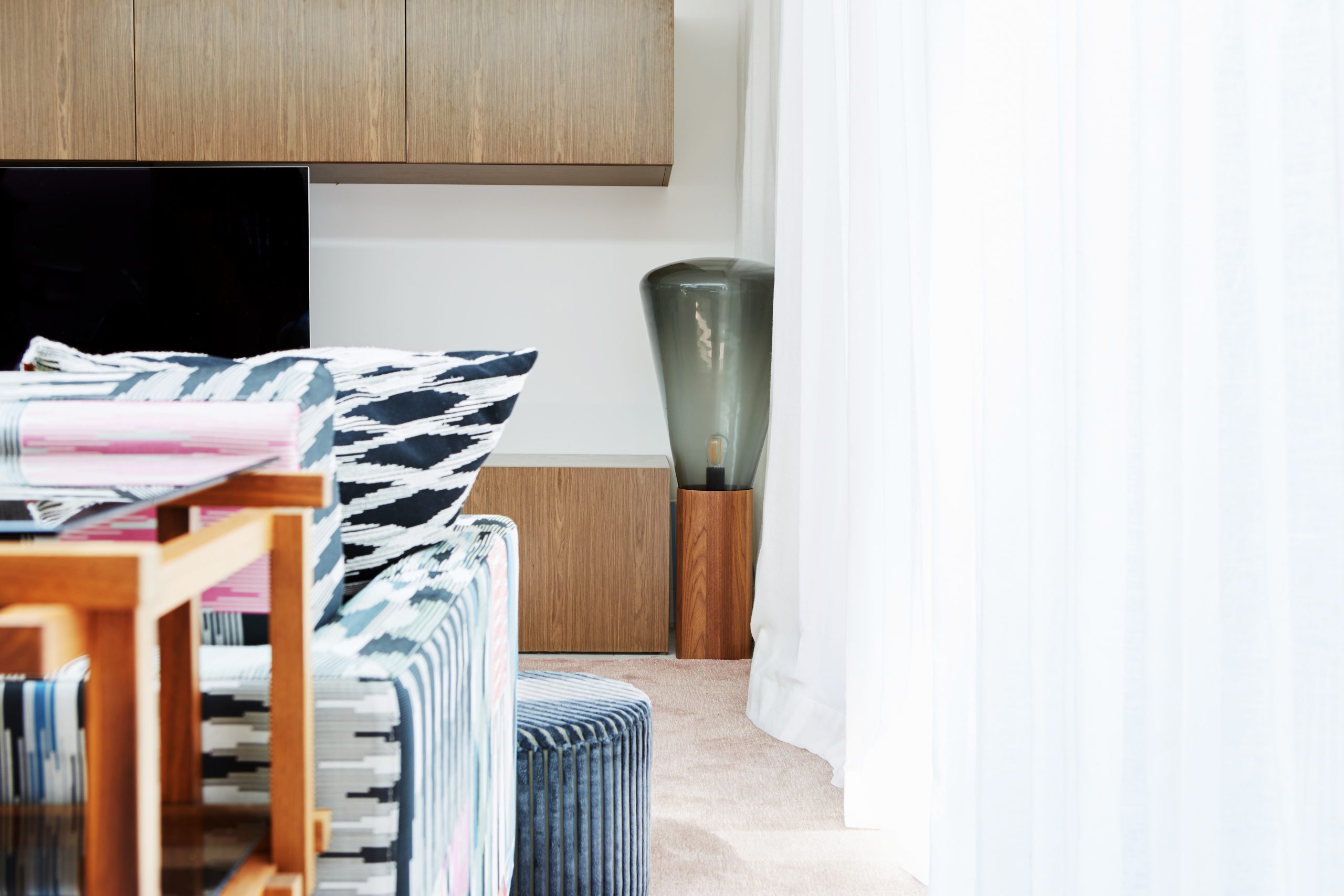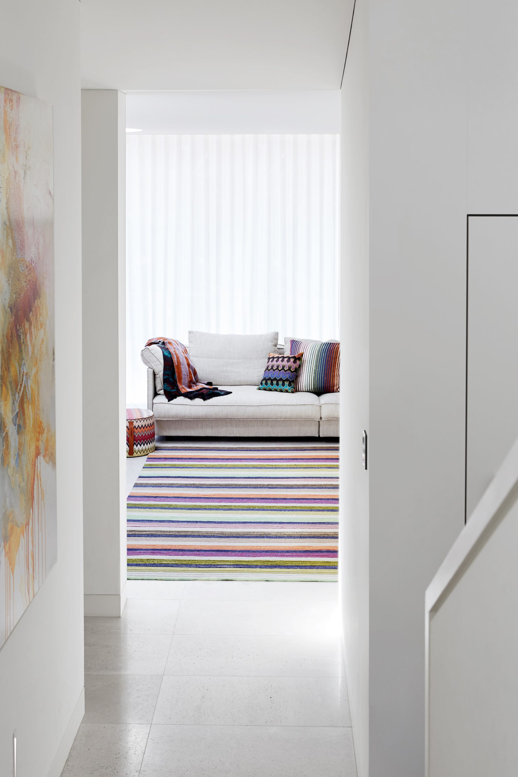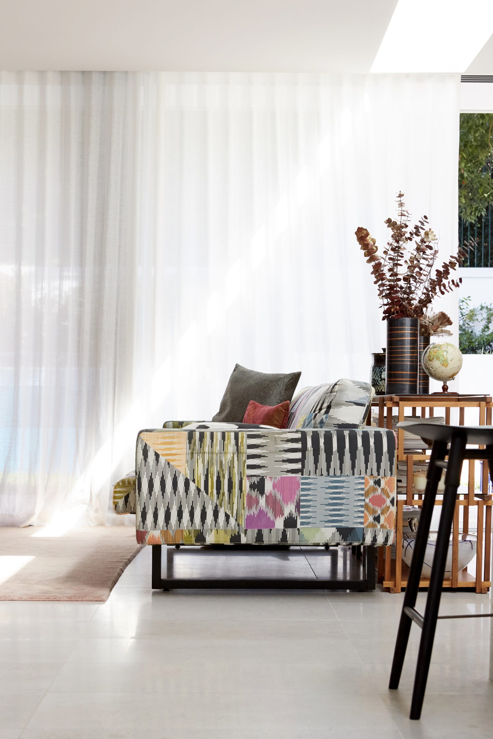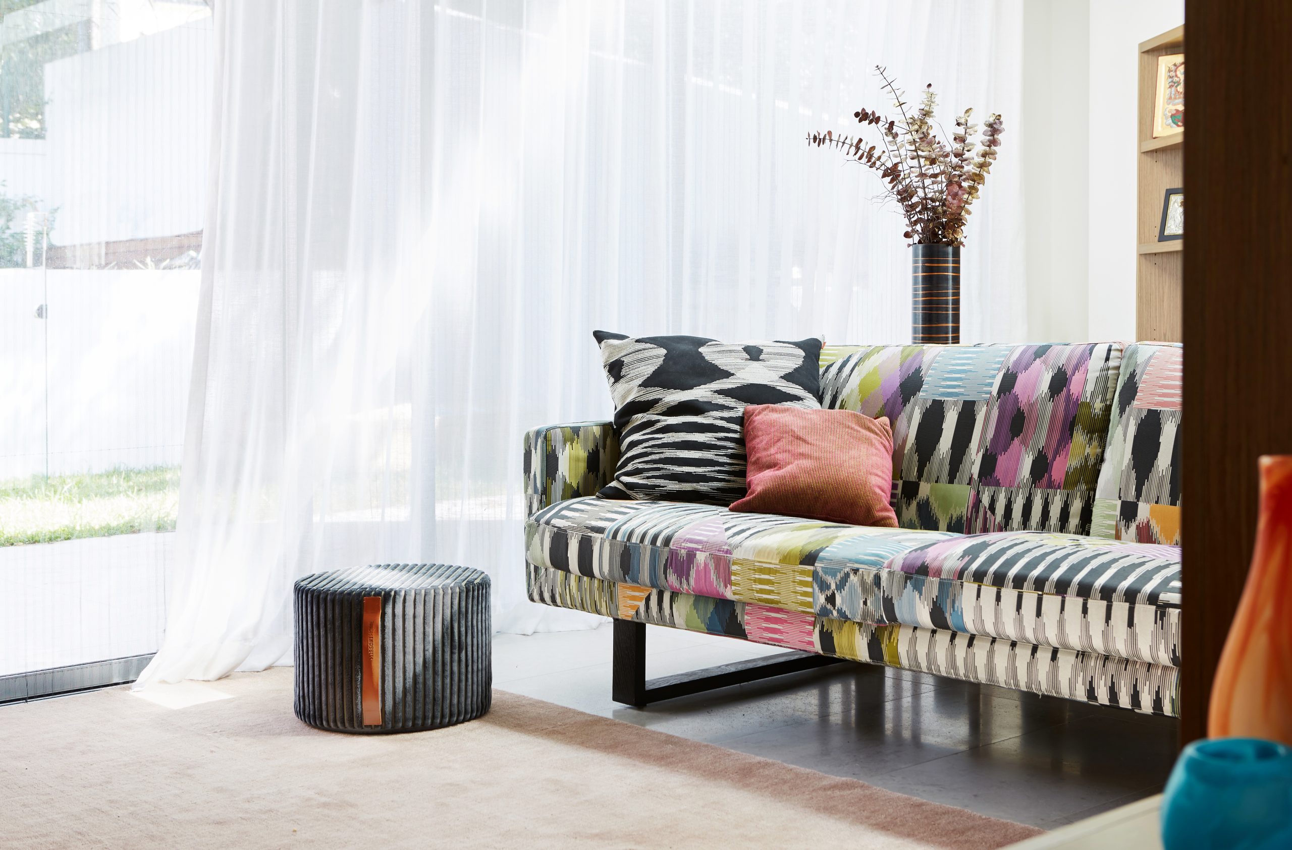 Ce projet de décoration d’intérieur de maison a été conçu comme une véritable mise en scène, pensée pour refléter la personnalité audacieuse et festive des clients. Le travail s’est concentré sur une sélection pointue de luminaires, de mobilier sur mesure, d’objets décoratifs, de coussins, de tapis et sur un styling soigné, complété par une curation d’art destinée à créer un intérieur vibrant et expressif. La maison se distingue par une palette colorée et exubérante, imaginée pour être pleinement vécue et admirée. Les tissus Missoni ont été choisis pour habiller les coussins, les tapis et un canapé sur mesure, apportant rythme, couleur et une touche iconique de gaieté. Chaque élément de décoration a été pensé dans une démarche d’harmonie et de contraste, afin de créer un intérieur unique, élégant et résolument joyeux, idéal pour recevoir et partager.